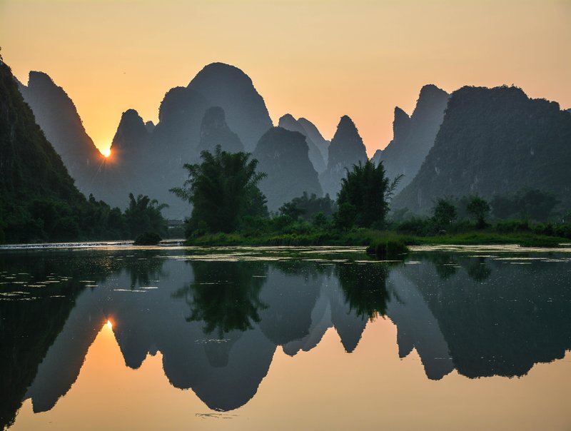 浓郁的时候,好像春天的云彩。轻薄的时候,好像袅袅炊烟。参差不齐的绿树,把剪影倒映在了奔流的大江中。夕阳西下,拉开船篷,静静地坐下,富春江的翠色仿佛要把小船淹没。
