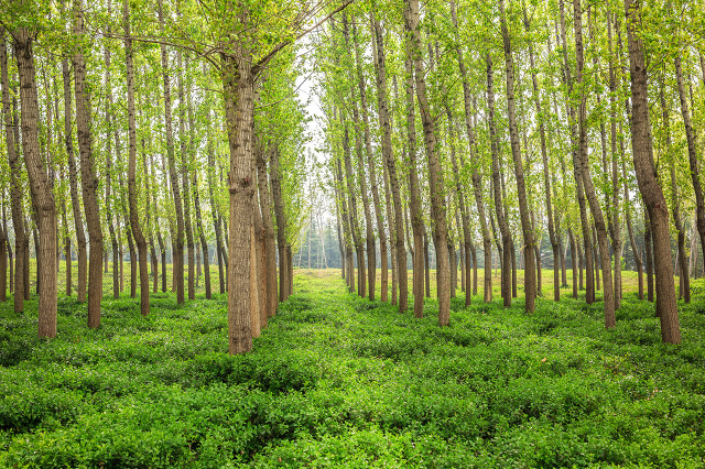 街道两旁,白杨树枝繁叶茂,仿佛撑开了一把把绿色的大伞,形成一个连绵不断的遮阳棚,行人走在林荫道上,非常惬意。