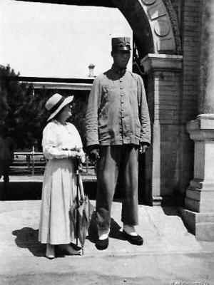 这其中尤以刘玉清有名。刘玉清是直隶保定府人,按照旧京报纸上刊登的信息推算,他应该生于1890年,身高七尺四寸,体重二百七十斤,大约能跟姚明比肩。《实报》上说:“他所坐的椅子,就到咱们脖子高,他的鞋有咱们两只长”。刘玉清平日里穿一件灰布袍子,套着青马褂,戴一顶瓜皮小帽子,白袜黑鞋,低着头慢慢地走路,即便如此,那脑袋也老在人家房檐边儿上晃摇。每逢他走过,必定有人注目看着他,身后照例有一群孩子跟着,一边走一边嚷嚷:“嗬,好高,咱们跟他比比个儿去!”刘玉清生性善良淳朴,总是默默地走自己的路,从来不去轰赶那些孩子。在万牲园门口验票时,他和魏集贤喜欢弯下腰来和小孩子逗趣,或者把腿跷起来,踏到对面的铁栏杆上,让孩子们从他们的大长腿下“钻山洞”,还时常踮起脚尖,用手触摸大门上的砖雕。