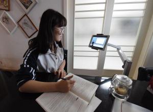 一名高夏中学生在家观看直播课程正