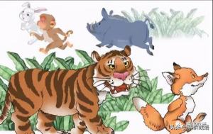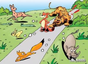 他们走没多久,就隐约看见森林的深处,有许多小动物正在那儿争相觅食,但是当它们发现走在狐狸后面的老虎时,不禁大惊失色,狂奔四散。