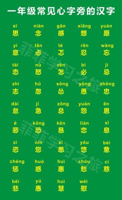 我们了解了这些知识,再来看看我们一年级常见的心字旁的汉字有:思、念、感、想、愿、意、忐、忑、忍、忘、态、怒、怎、必、忌、志、忽、怂、恿、忠、怠、急、总、怨、恩、恶、恐、恳、恋、息、恣、您、悉、悠、惫、惩、惑、惠、愁、慈、悲、愚、慧、慰等。